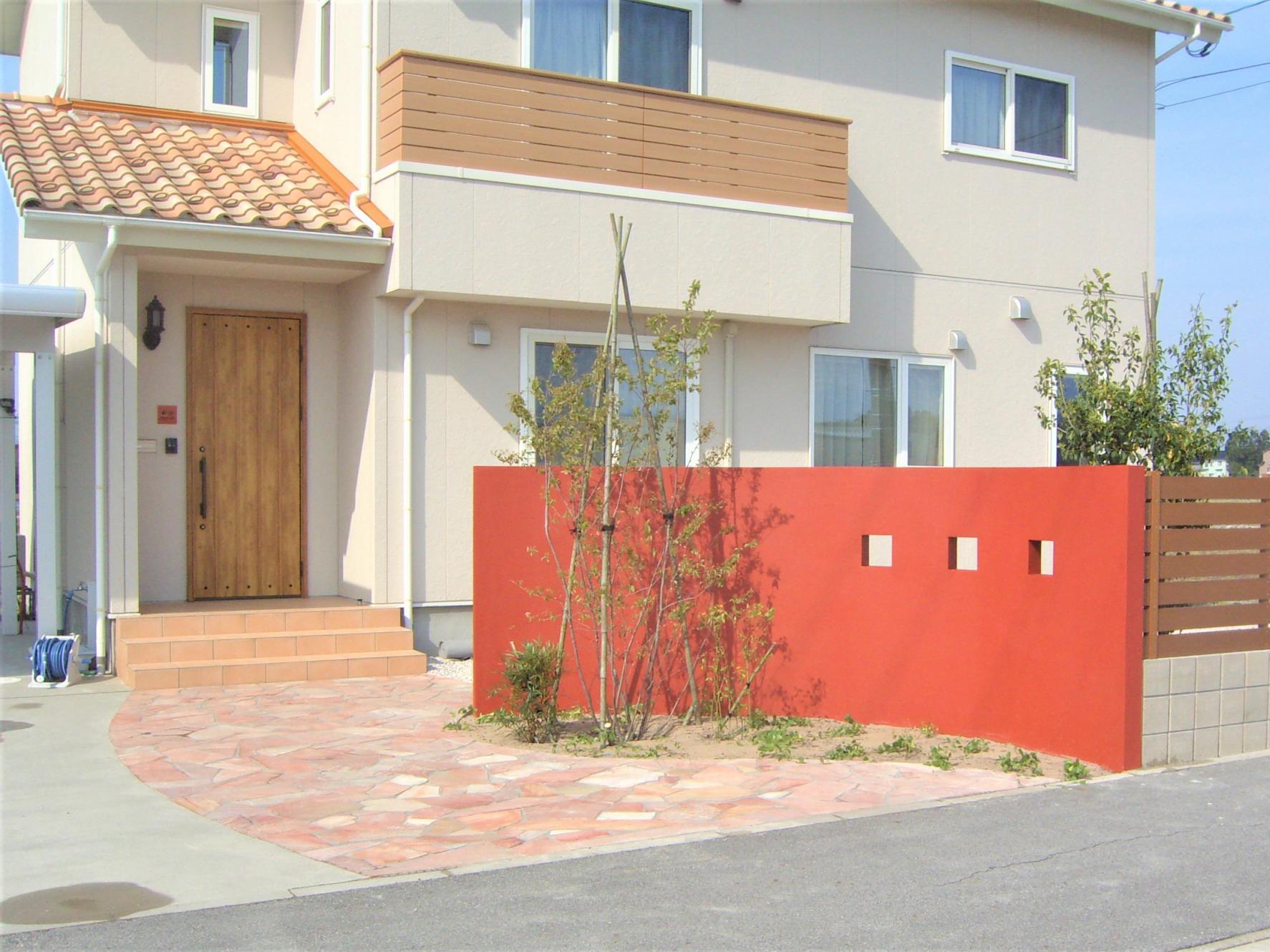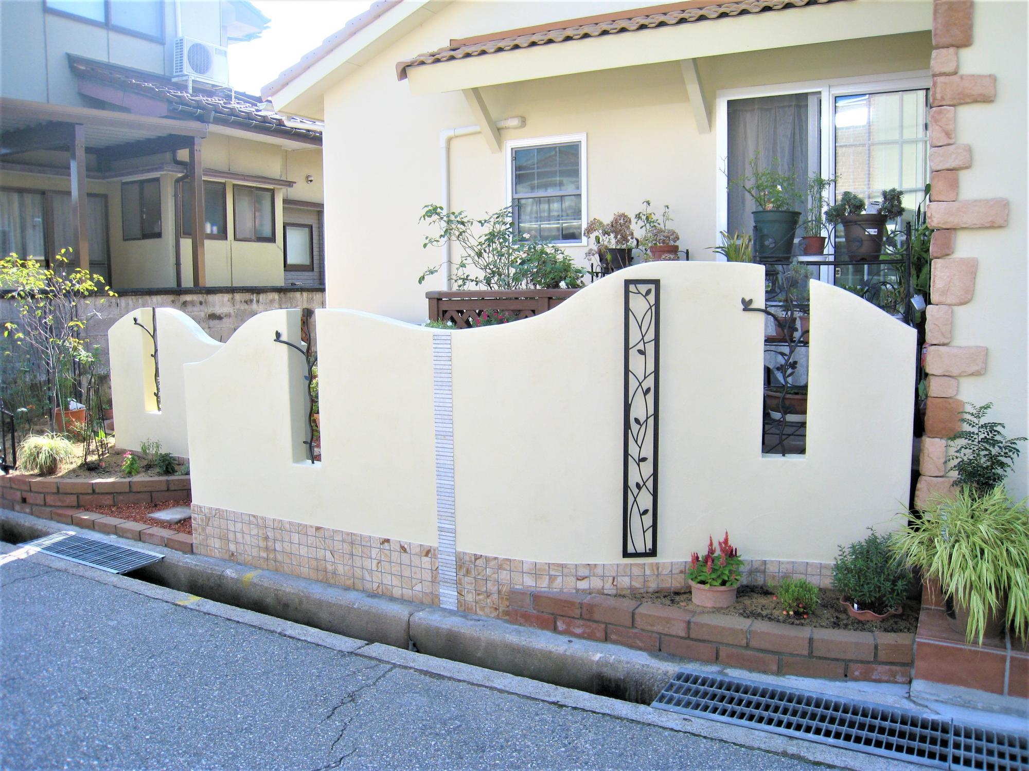 玄関と道路の間にはある程度の解放感があるセミクローズを設置。緩やかなカーブの塀にはお家の雰囲気に合わせて、モザイクタイルと鋳物の飾りを施しました。また、レンガ花壇には多年草やハーブやラベンダーなど、育てやすくて色鮮やかな植物を植え、可愛らしさも演出しています。