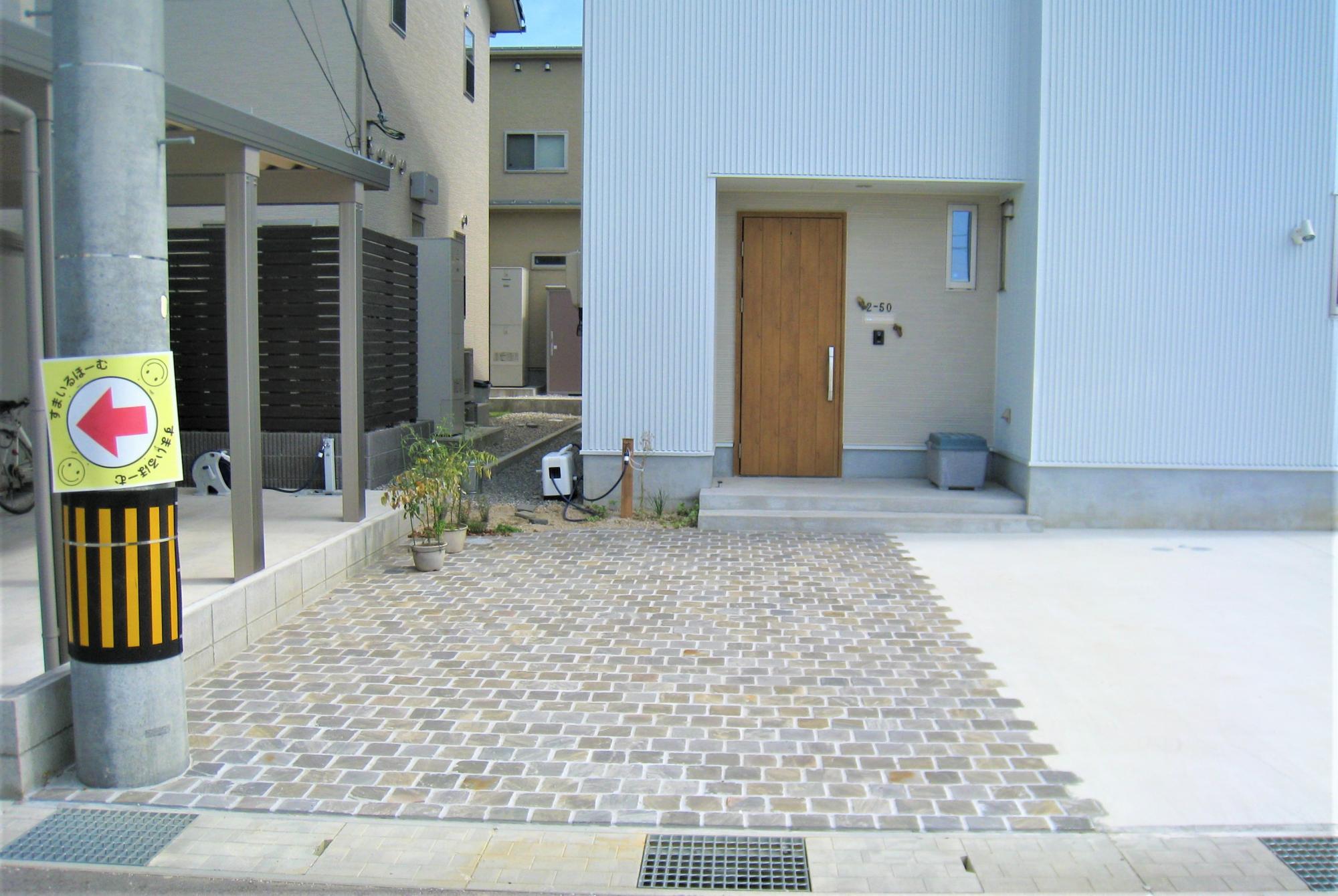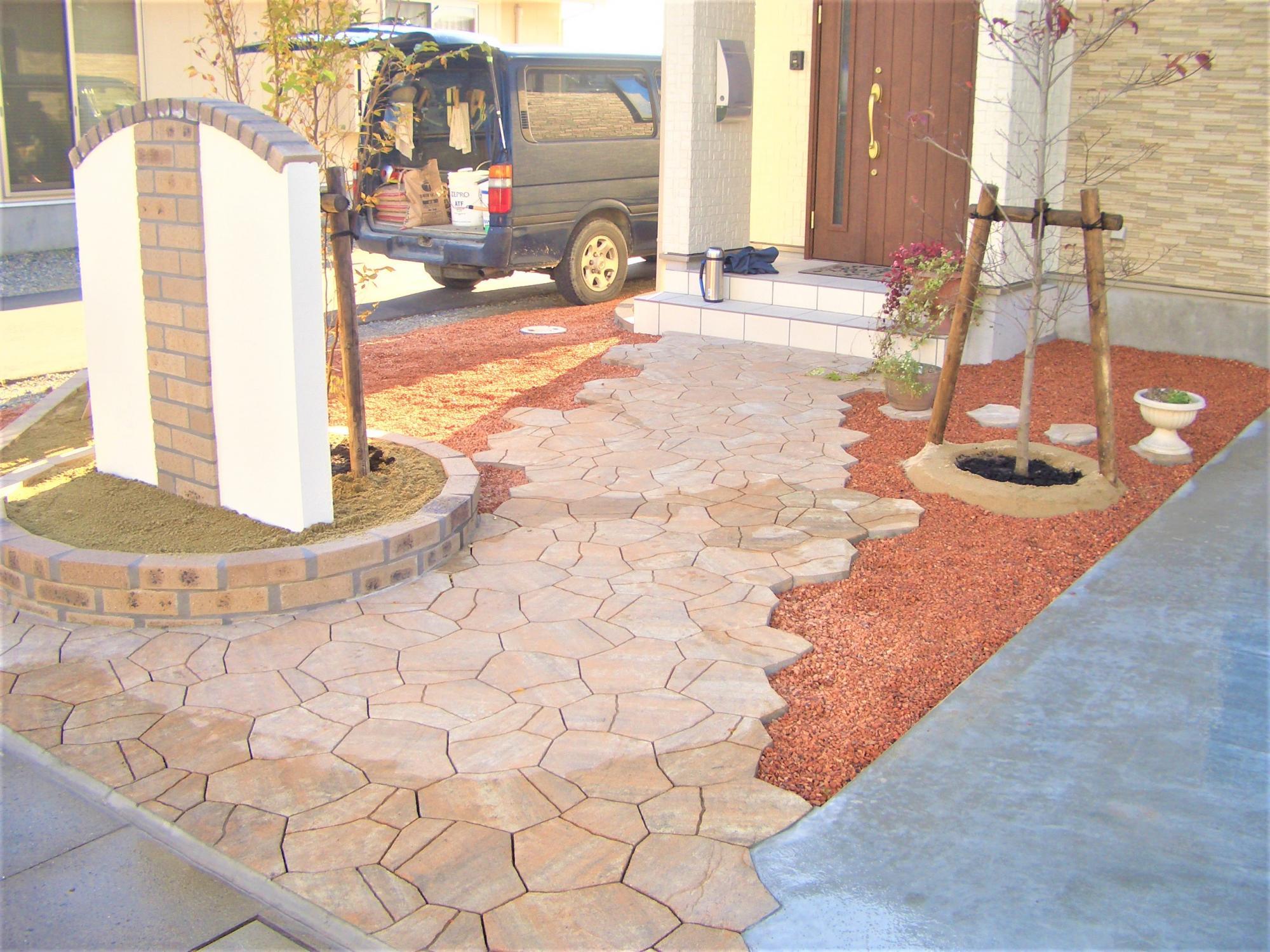 芝生がある玄関口をご希望されていたので、芝生を植え、境界にはブロックを積み、部分的に穴が開いたスクリーンブロックを採用しました。閉鎖的にならないようなデザインとメンテナンスが行き届いた緑色の芝生は、庭に明るくさわやかな印象をあたえてくれます。また、芝生の中でも車が駐車できるように、車のタイヤが通る部分のみ土間コンクリ―トを打ち、見た目の美しさだけでなく、利便性も高めました。