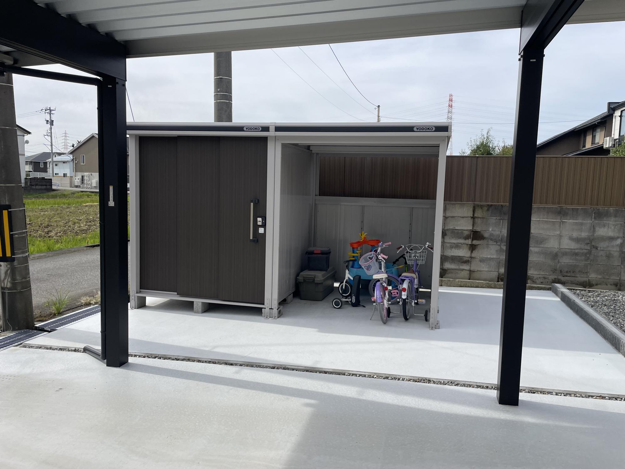 カーポートと合わせたカラーでまとまりがある物置となりました。
