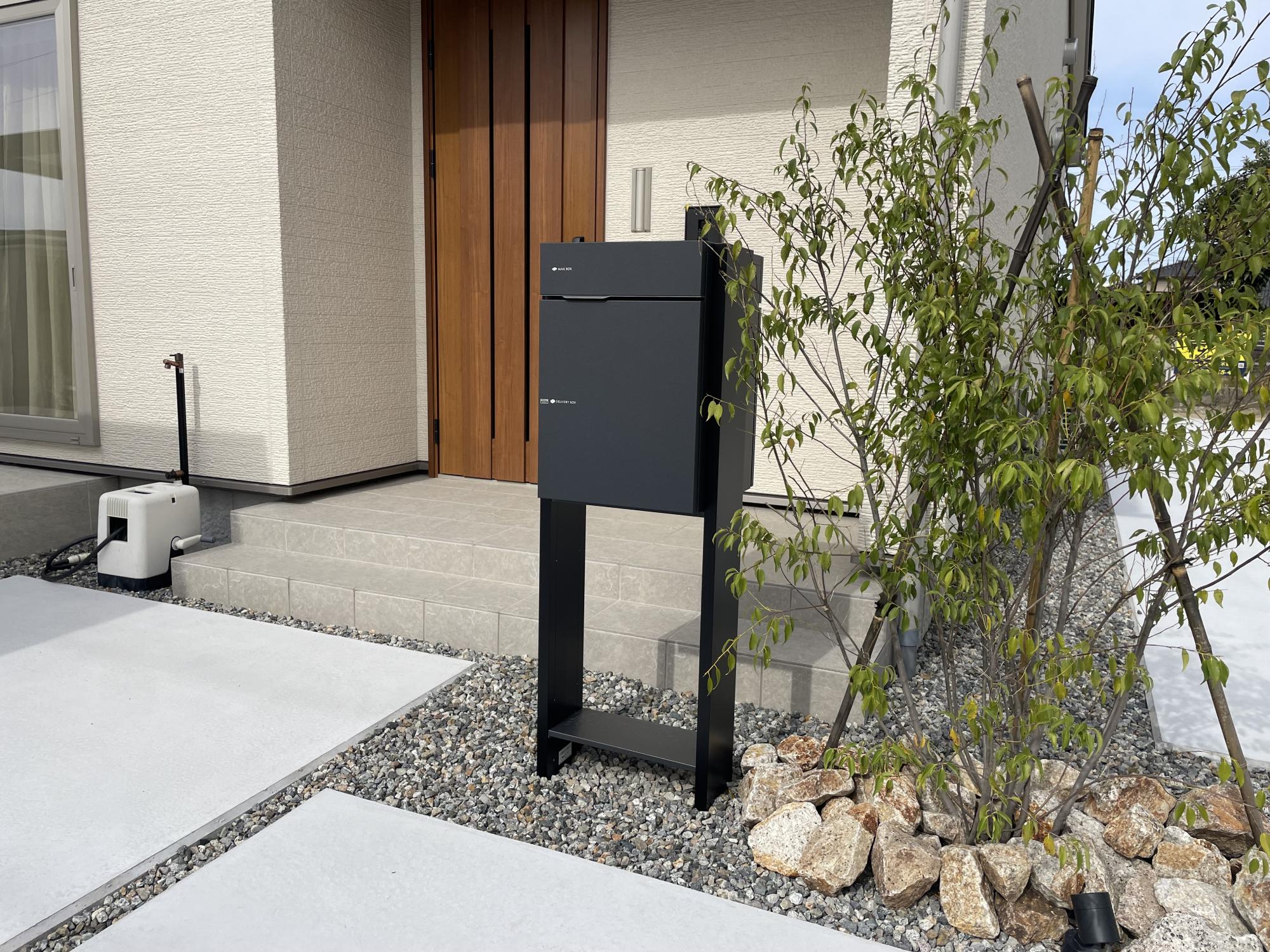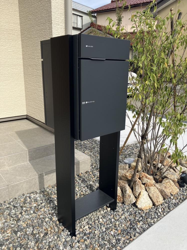 黒のポスト”ユニソン ヴィコDB100”を設置し、カーポートのカラーと合わせて締まりのあるクールモダンな印象になりました。