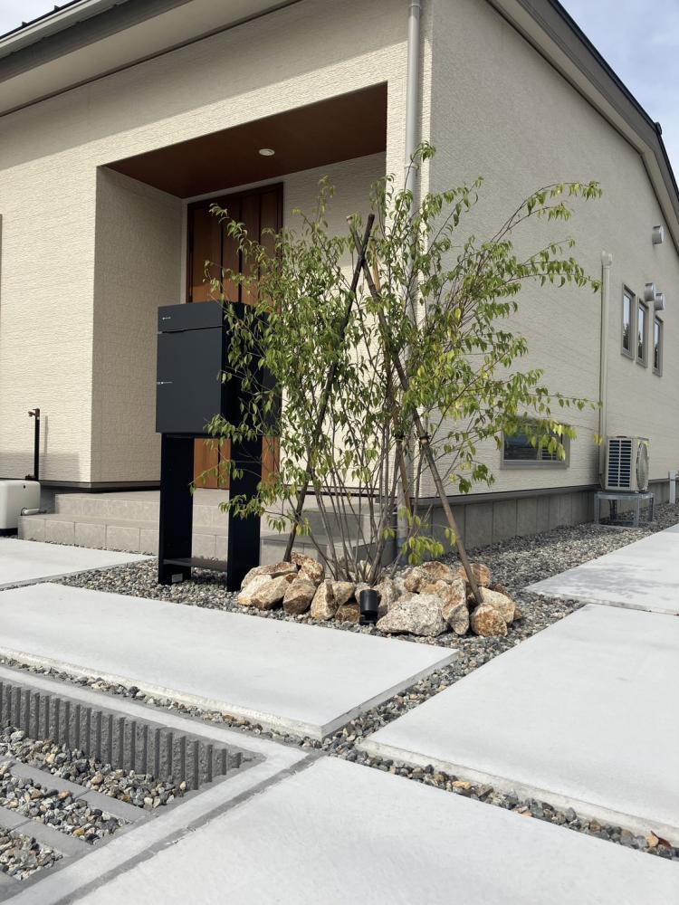 ポストの横にはシンボルツリーの植栽をいれ、根本には大小さまざまな石材をいれることでナチュラルロックガーデンに。